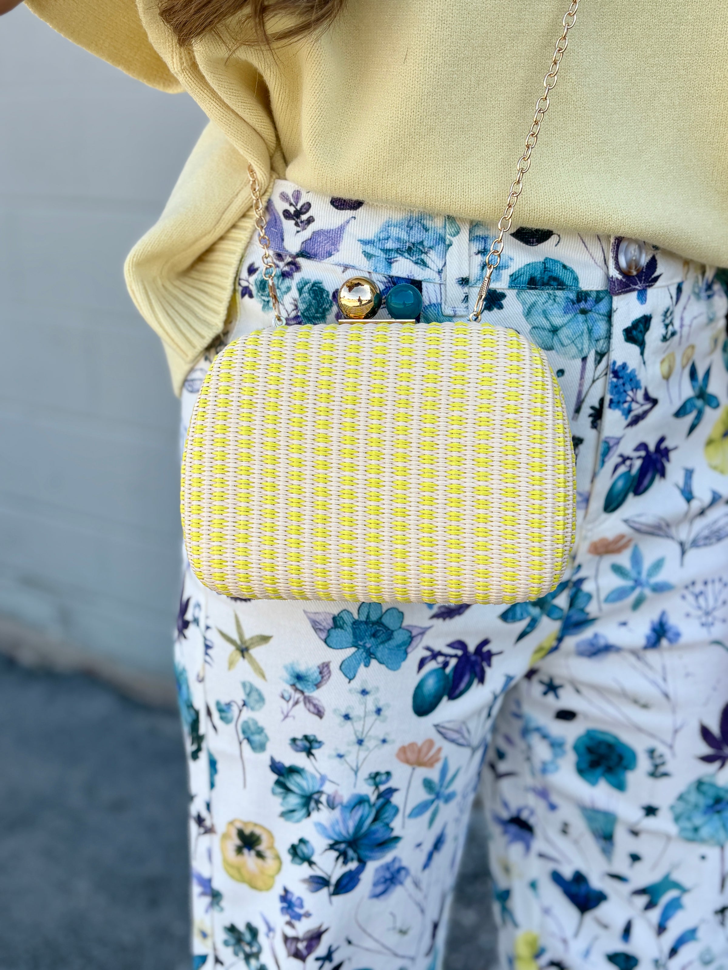 Turn heads with the Bondi Minaudière, the ultimate pop of color for your summer wardrobe. This structured clutch features a vibrant woven body and eye-catching double orb magnetic frame closure. The detachable gold chain adds versatility, so you can wear it crossbody or carry it as a statement piece. Compact yet chic, it’s the perfect companion for everything from beachside cocktails to rooftop soirées.