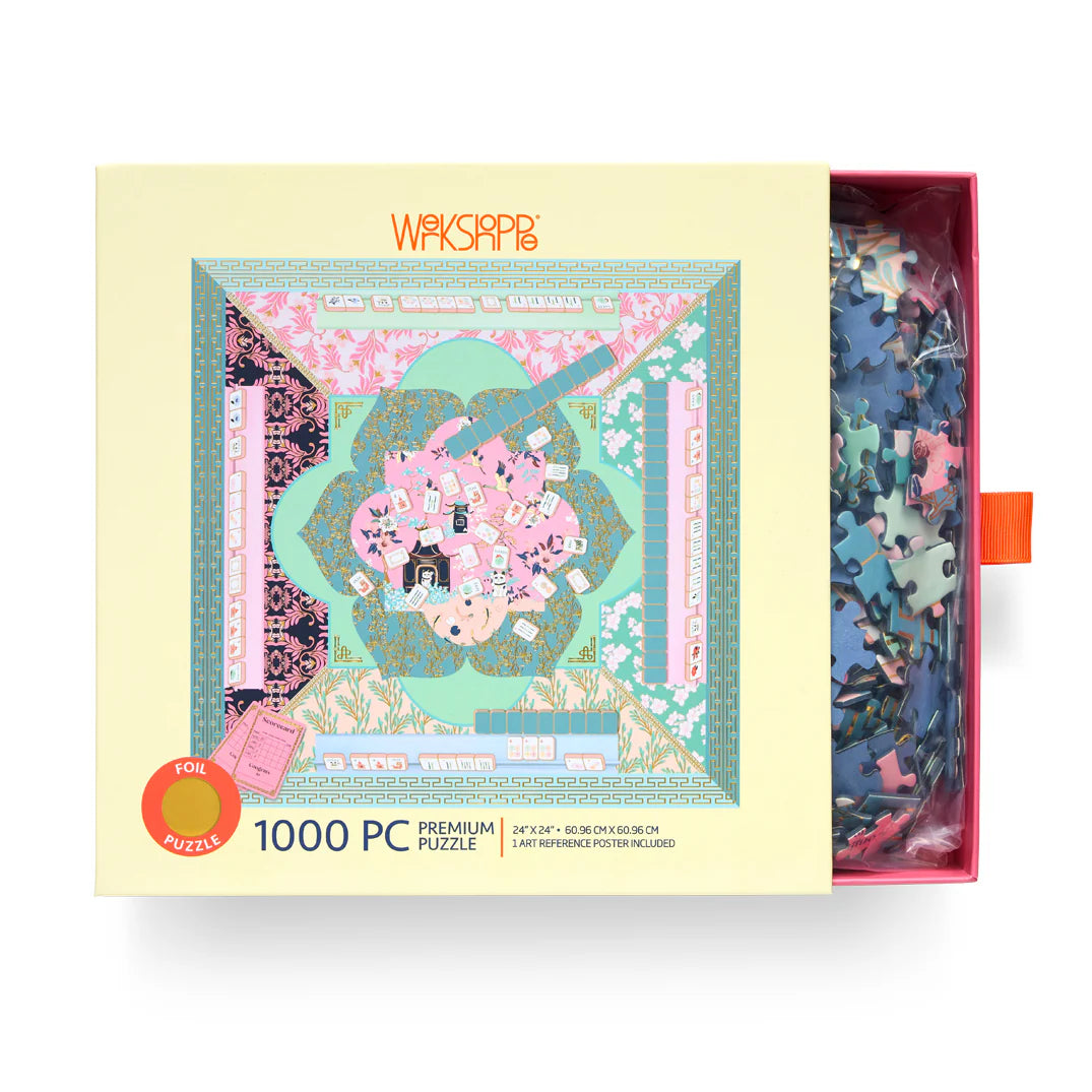 The intricate design features a central lotus bloom surrounded by stylized Mahjong tiles, delicate florals, and charming, whimsical figures. Rich shades of sage green, powder pink, and navy create a sophisticated palette. As a final, luxurious touch, the puzzle includes gold foil detailing that catches the light and elevates the finished image to a piece of displayable art.