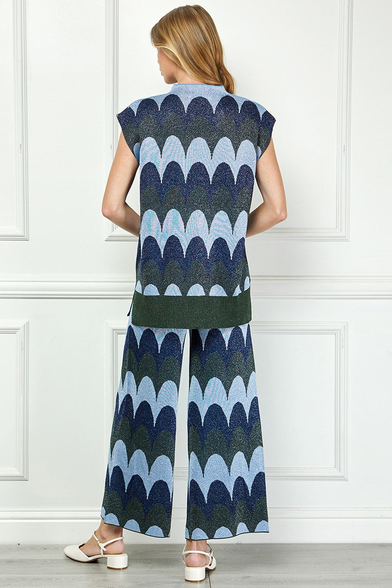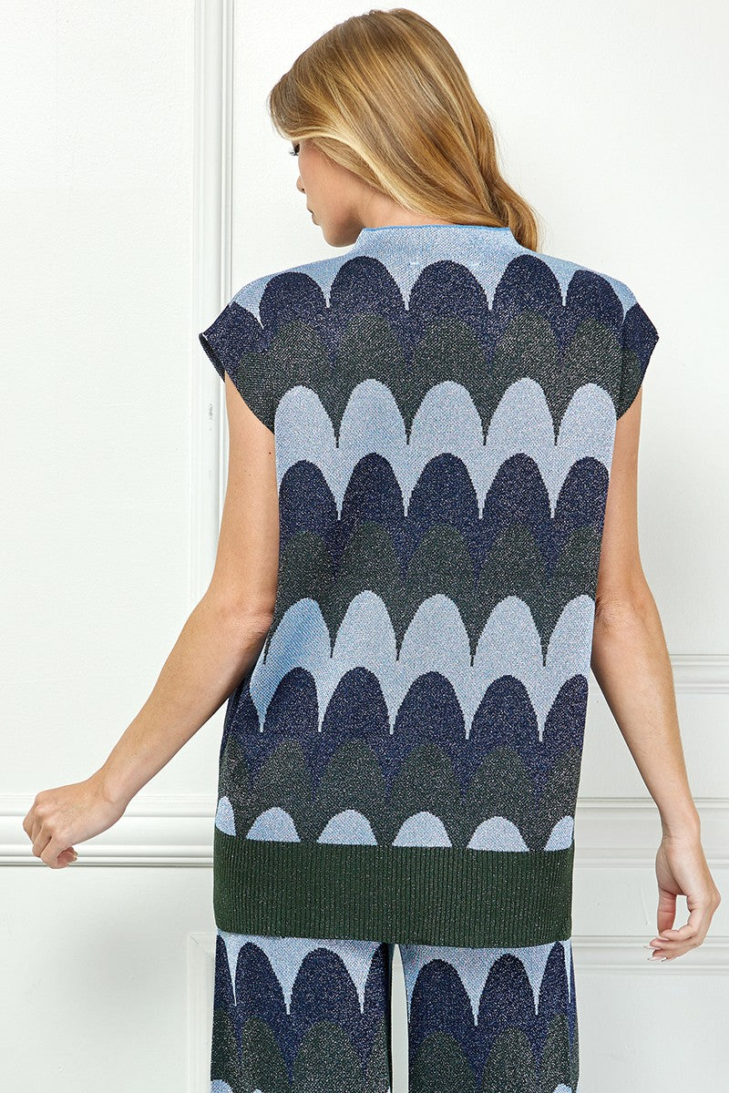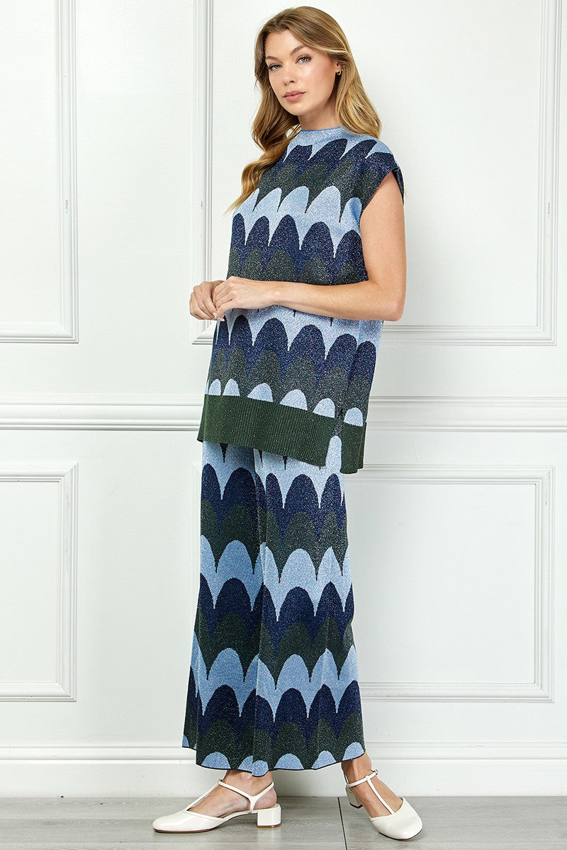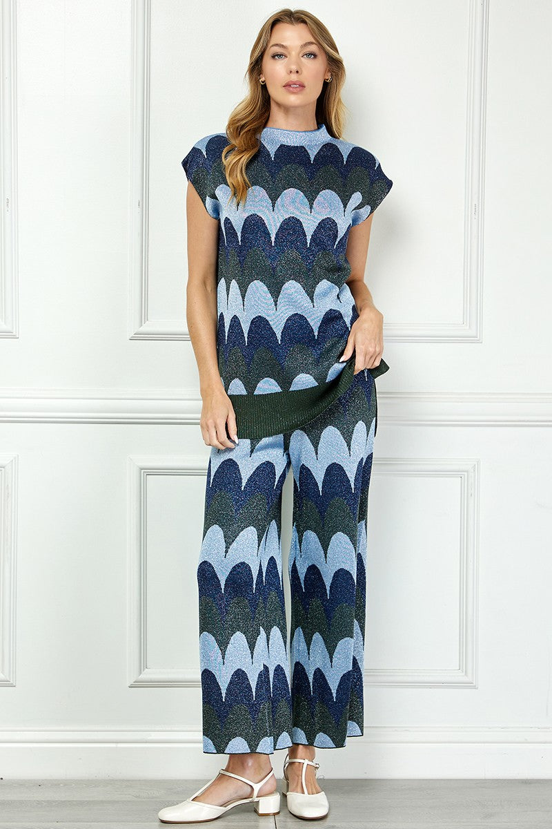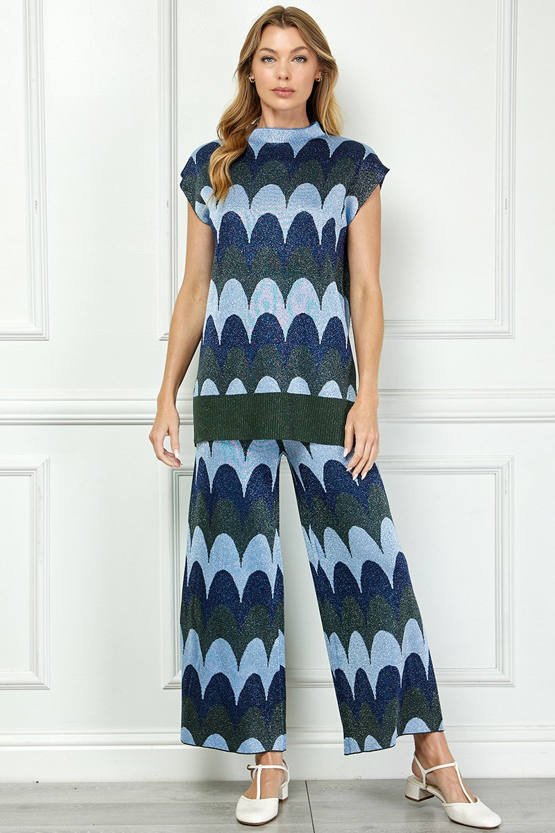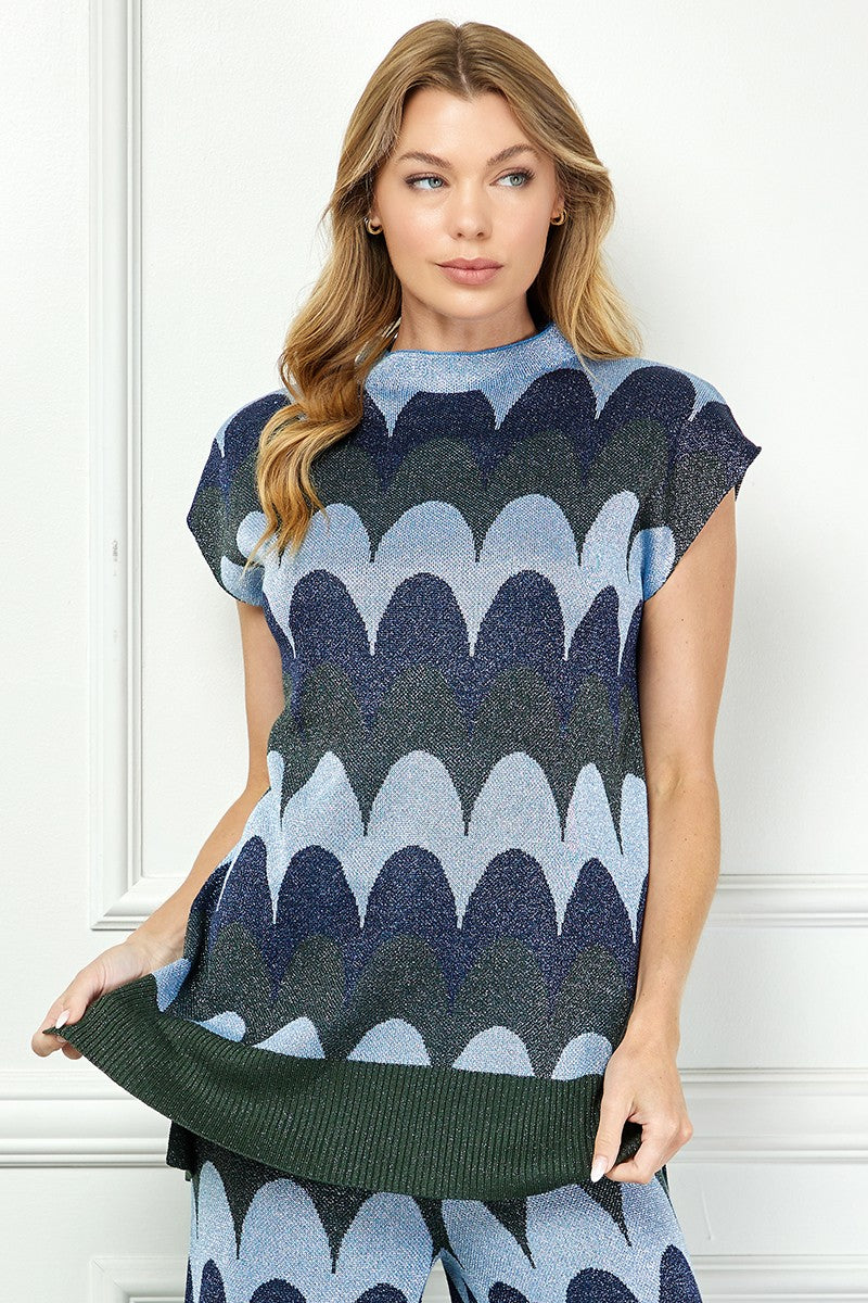 A chic and modern knit top featuring a bold scalloped wave pattern in shades of navy, teal, and sky blue. Designed with a relaxed silhouette, it includes a mock neckline, cap sleeves, and a ribbed hemline that adds structure to the fluid drape. Crafted from a soft, textured fabric with subtle shimmer, this versatile piece effortlessly combines comfort with statement style. Perfect for pairing with matching bottoms or styling separately for a standout look.