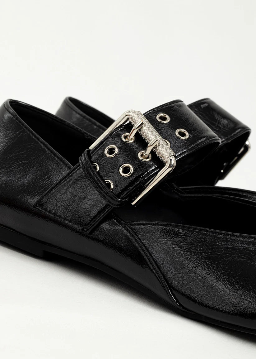 Bold meets ballet. The ASPEN flat in Black takes the classic silhouette and adds a statement-making twist with a wide strap and oversized silver buckle. The glossy faux leather adds edge, while the rounded toe and slim sole keep it grounded. Pair it with tailored trousers or flowy skirts-it’s the flat that does both polish and attitude.