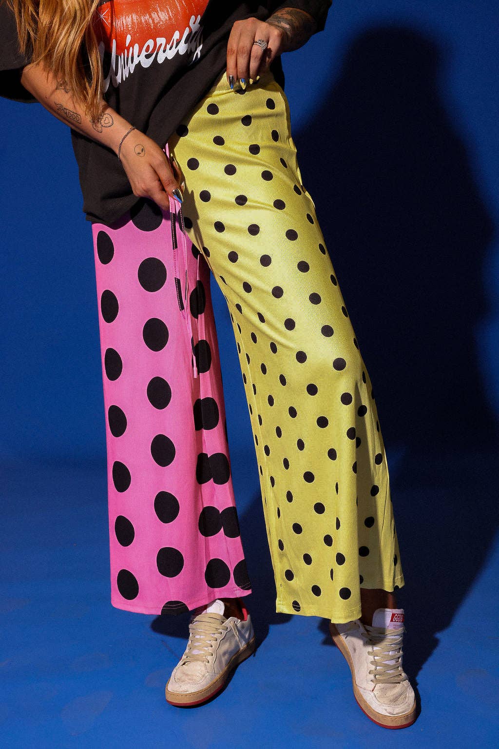 Half sweet, half loud, fully iconic. The Polka Dot Pop Half & Half Pants flip pink and yellow into a clash-core combo that somehow just works. With a wide-leg cut, super stretchy drape, and a comfy drawstring waistband, these are the pants you can actually live in... and trust, you will.