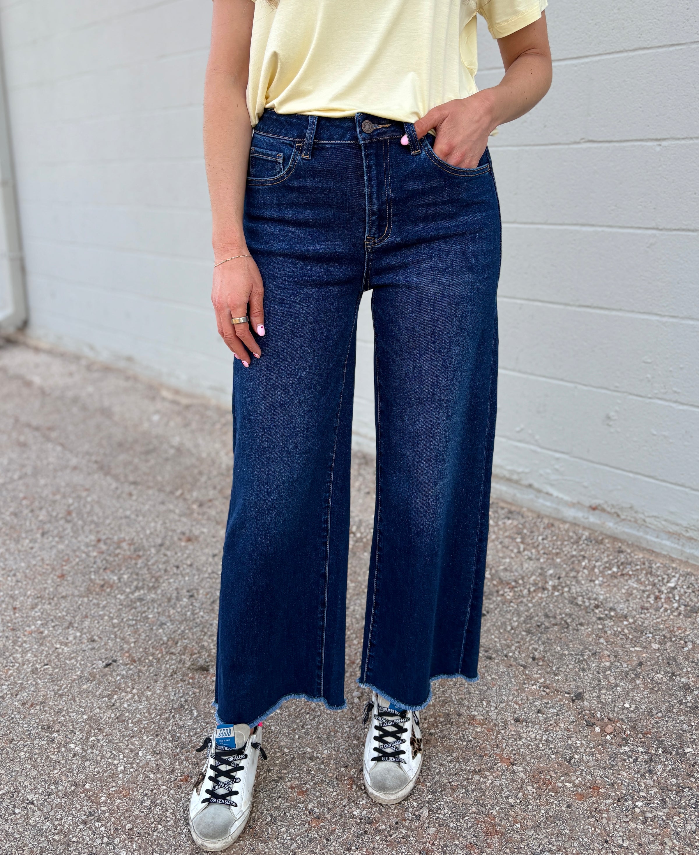 HIGH RISE DARK WASH ANKLE WIDE LEG JEANS COMFORT STRETCH DENIM, HIGH RISE WAIST, 5 POCKETS, FRAYED HEM, ANKLE LENGTH, DARK WASH, WIDE LEG JEANS F. RISE: 10 1/2" / INSEAM: 28" / LEG OPENING: 21"