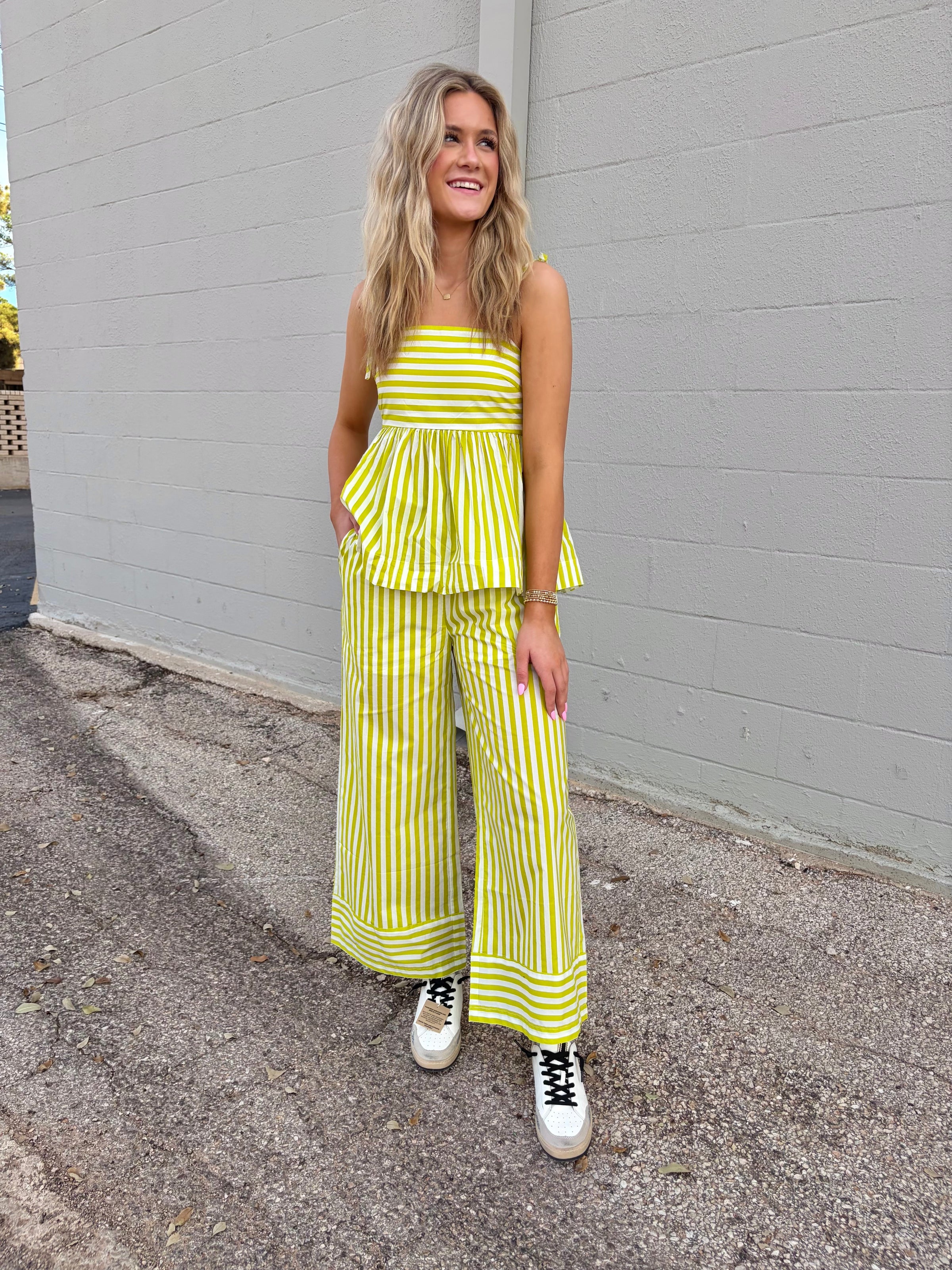 Striped sleeveless top featuring adjustable tie shoulder straps. Smocking at back. Unlined. Woven. Non-sheer. Lightweight.